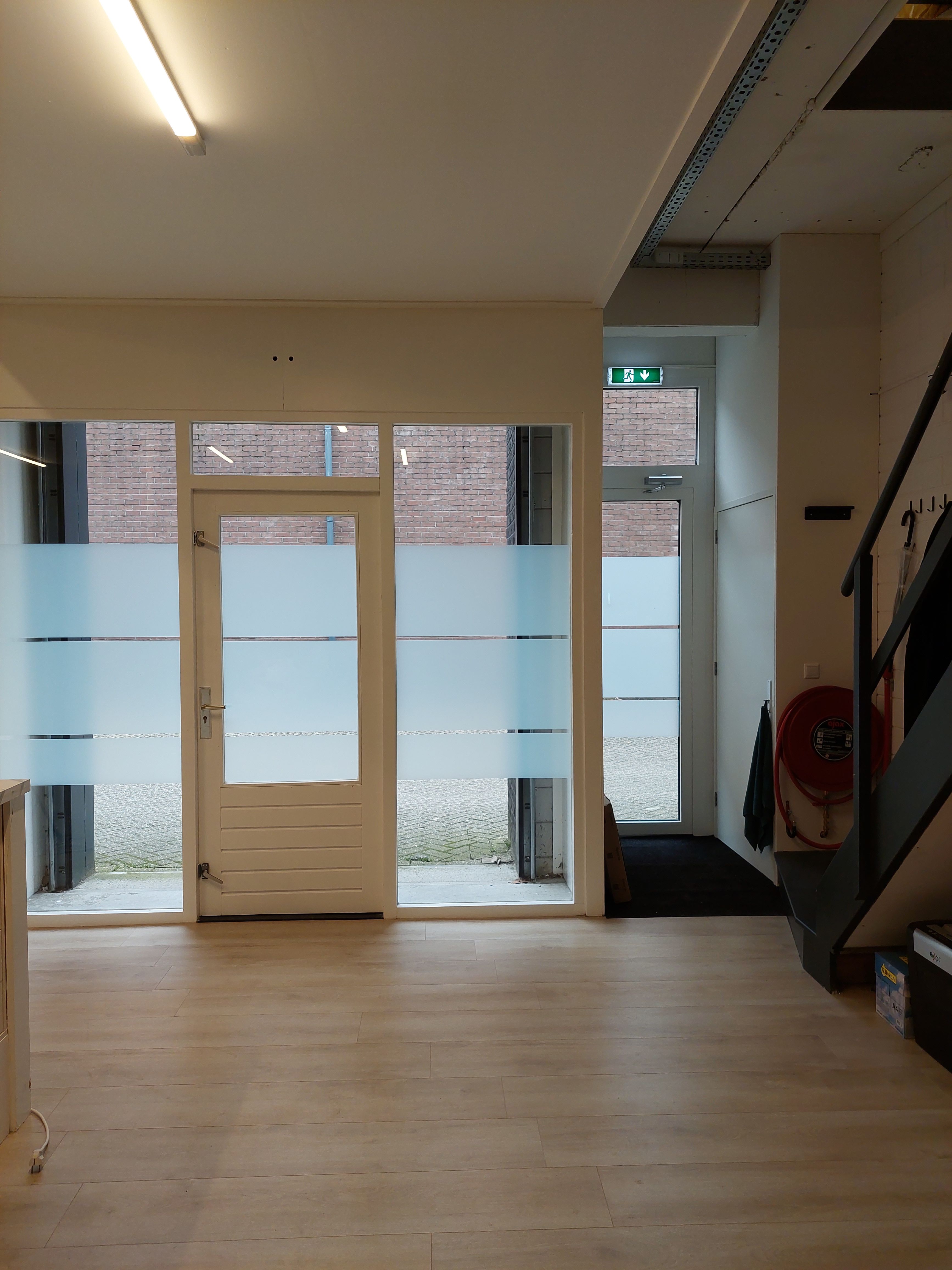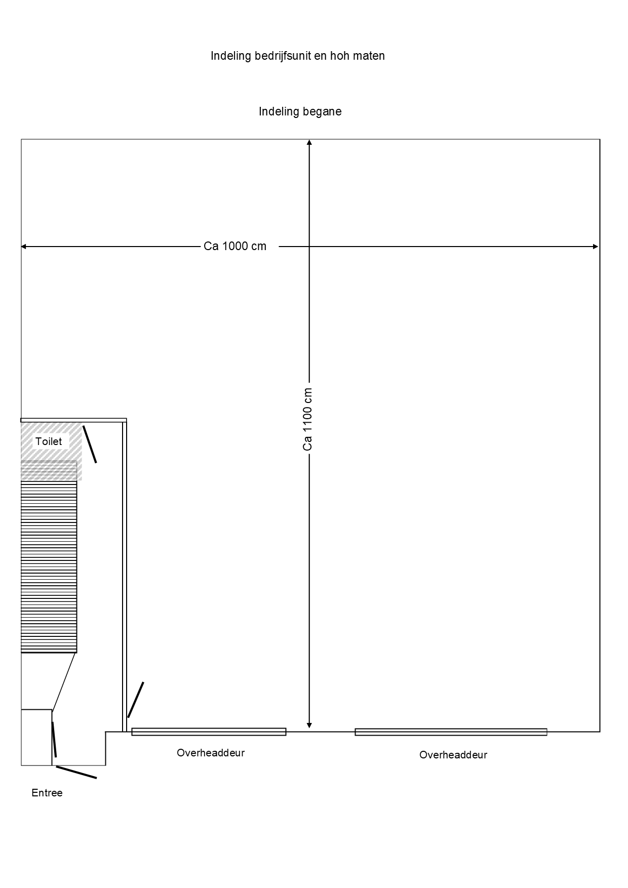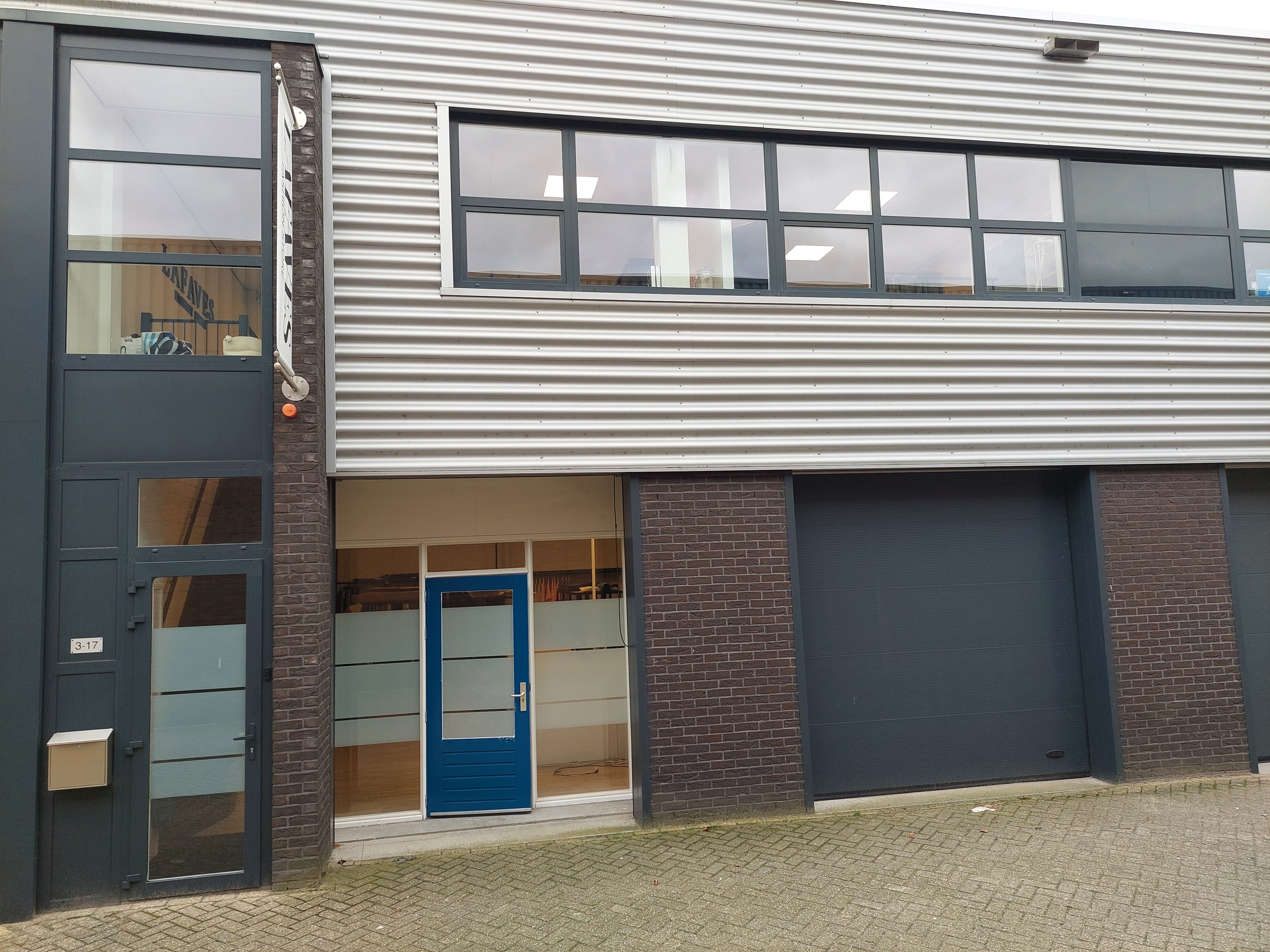Deze unit heeft twee overheaddeuren en een loopdeur op de begane grond. Achter de overheaddeuren is momenteel een kozijn met loopdeur en glas geplaatst waardoor de begane grond ook te gebruiken is als winkel, kantoor en/of werkplaats.