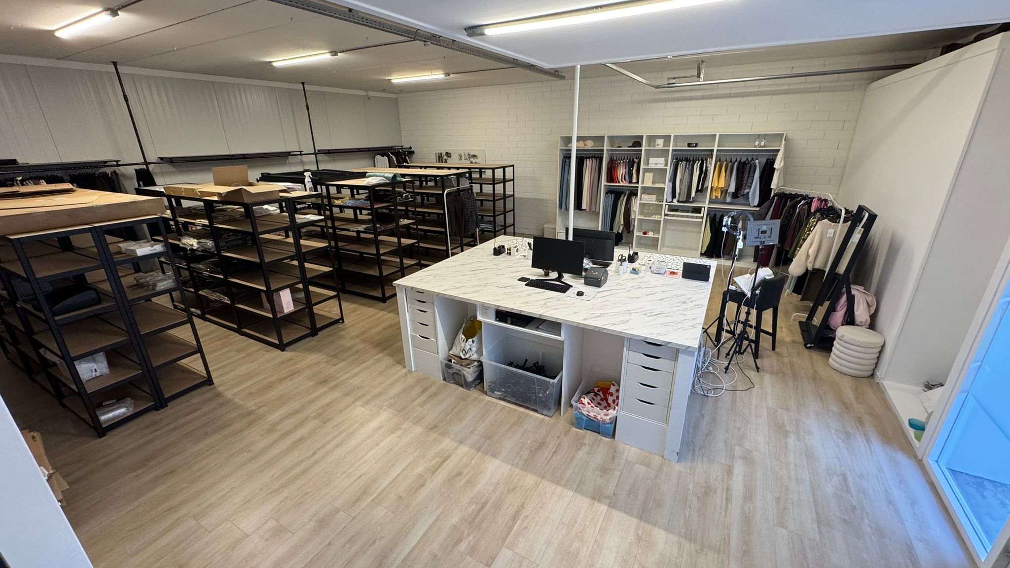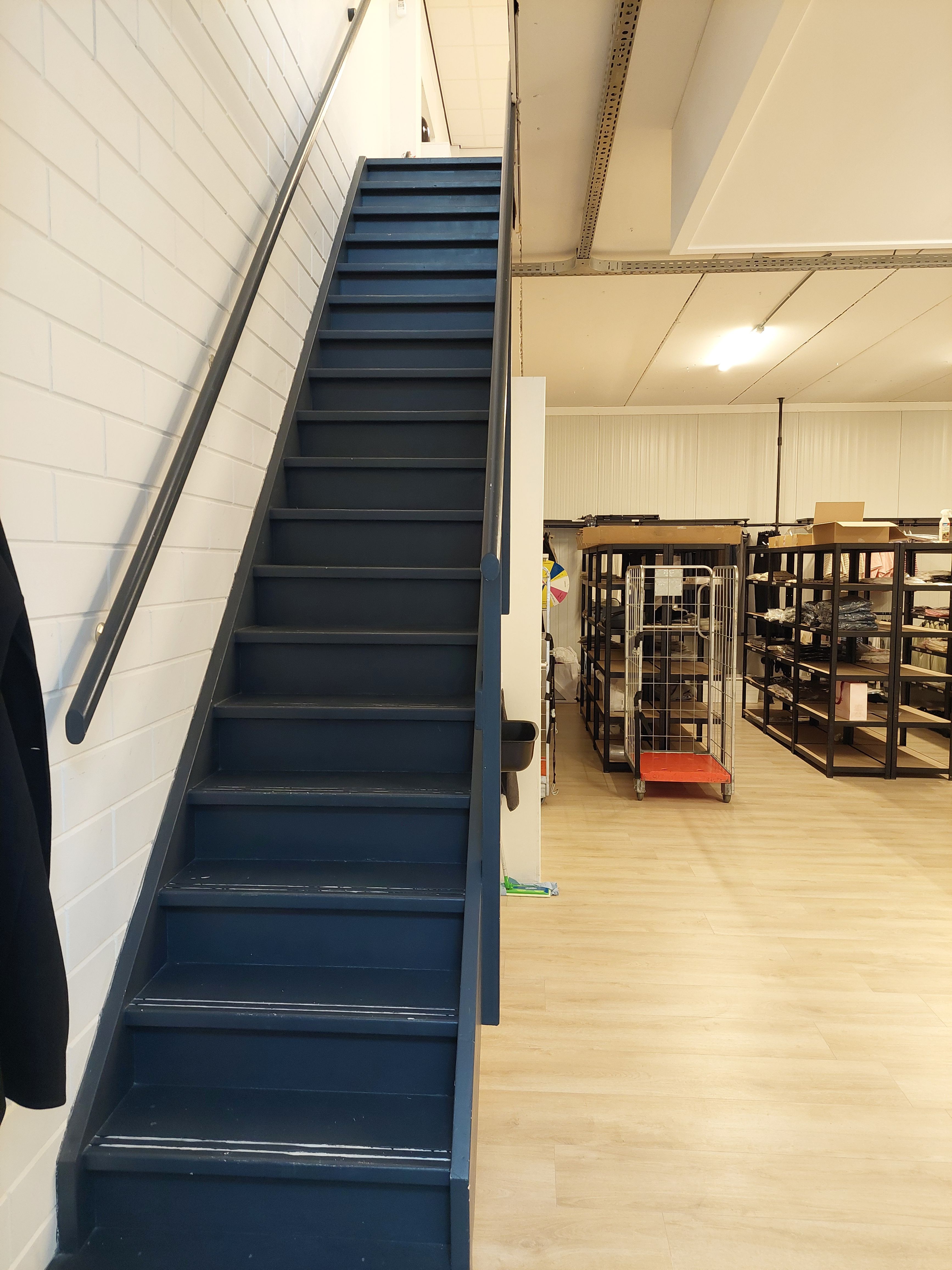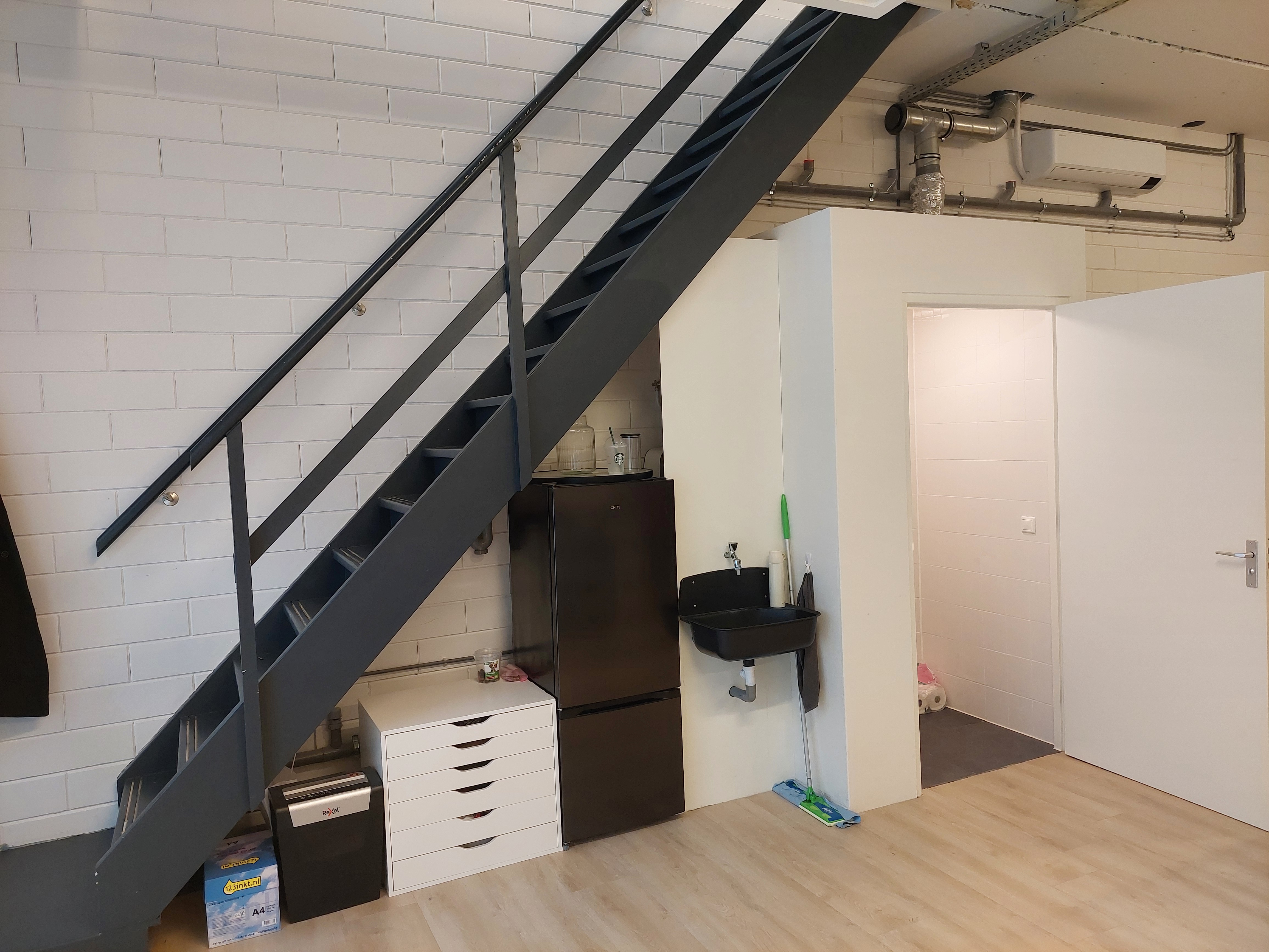 Deze unit heeft twee overheaddeuren en een loopdeur op de begane grond. Achter de overheaddeuren is momenteel een kozijn met loopdeur en glas geplaatst waardoor de begane grond ook te gebruiken is als winkel, kantoor en/of werkplaats.